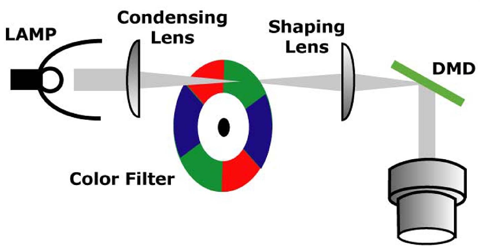 Om nu een beeld te maken wordt eerst als basis een zeer sterke lichtbron via lenzen op de spiegeltjes gericht. Door de elektronica wordt nu bepaald of er op een pixelpunt wel of niet beeld moet verschijnen. Stel dat het alleen gaat om zwart of alle grijstinten. De spiegel zal bij zwart niet ombuigen en bij de grijstinten steeds langer schuin blijven. Bij maximale tijdsduur is dat dus totaal wit.