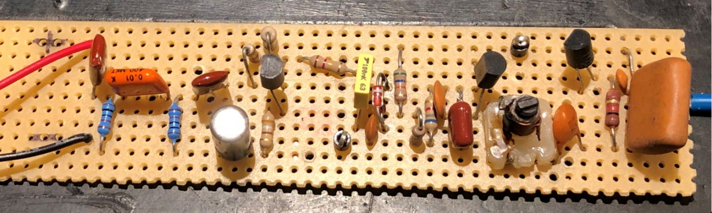 Ook het spoeltje van 4,7µH omgewisseld voor een 10,7 If bandfilter van een afbraak radio. Was vooral om zeker te zijn dat het ferriet geoptimaliseerd is voor deze frequentie. Bij gekochte universele spoeltjes ben je nooit zeker of dat zo is. (en dan loopt het ding minder stabiel en/of met lagere amplitude)