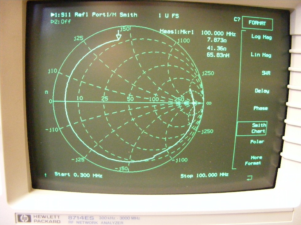 Op de volgende foto is de (zend) poort aangesloten op een hoogohmig punt (open coaxkabel). Je ziet dan dat alle energie terug komt en dat , afhankelijk van de frequentie, zowel capacitief als inductief is.