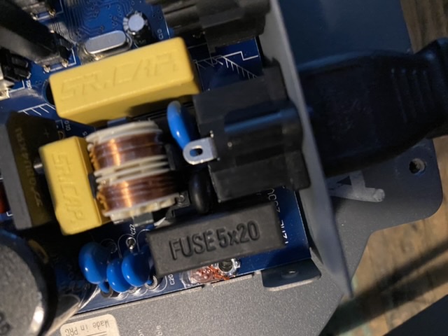 Waarschijnlijk ligt er iets in sluiting, waardoor de voeding hikt, d.w.z. hij probeert telkens te starten. Sluiting kan extern liggen, maar ook een kortgesloten diode. of een condensator in het secundaire deel kan de oorzaak zijn. Meten is weten . Zomaar lukraak wat vervangen levert meestal alleen een berg ergernis op.
