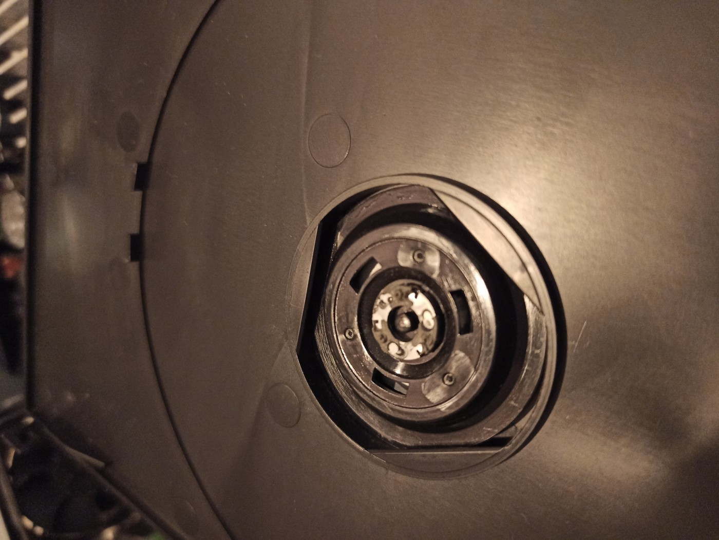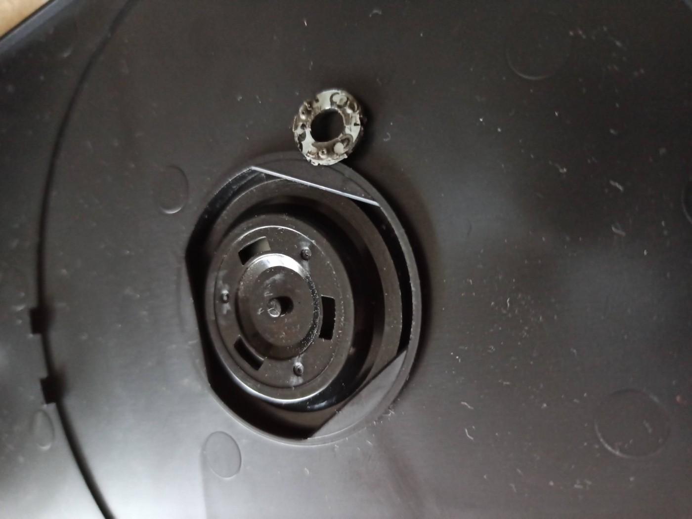 Ik kwam er vandaag achter dat het metalen ringetje in het aandrukschijfje van het deksel los kan.. Het blijkt een magneetje te zijn.