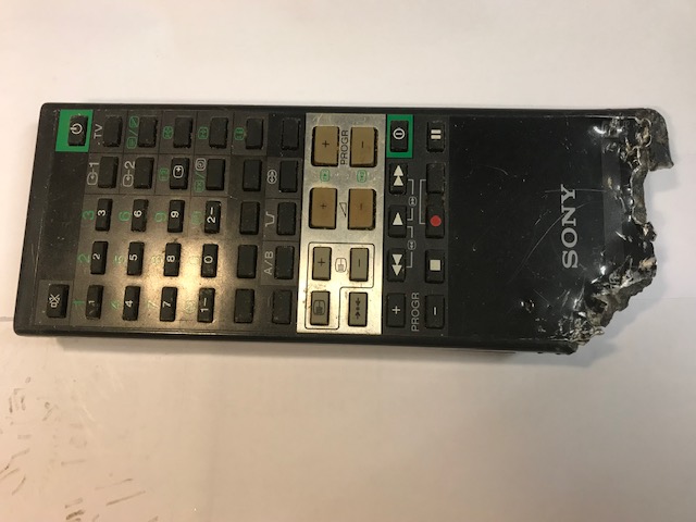 Deze afstandbediening roept bij mij herinneringen op aan het bezit van een SONY black trinitron televisie 66 cm. en niet te tillen met ‘n enorme kont er achter