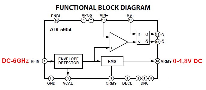 Op de SDPZ zit dus een HF detector type ADL5904 waarmee je van DC tot 6GHz kan meten. Op de uitgang staat dan een DC signaal waarvan de hoogte afhangt van het aangeboden HF signaal. Op dat zelfde SDPZ board zit ook een Analoog naar Digitaal converter in dit geval type AD7091R (12 bits). Uit deze A/D converter komt de digitale puls informatie die de hoogte van het HF ingang signaal vertegenwoordigd.