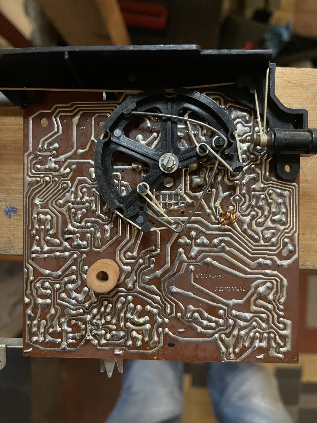 Op onderstaande foto ligt van de radio de snaar er af (ook al voor het démonteren) met los wieltje en ook gevonden een soort veer maar ik kom er niet uit bij in elkaar zetten. Een PHILIPS schema met snarenloop zou welkom zijn, meest kom ik er zelf wel uit maar is nu een complex geval.