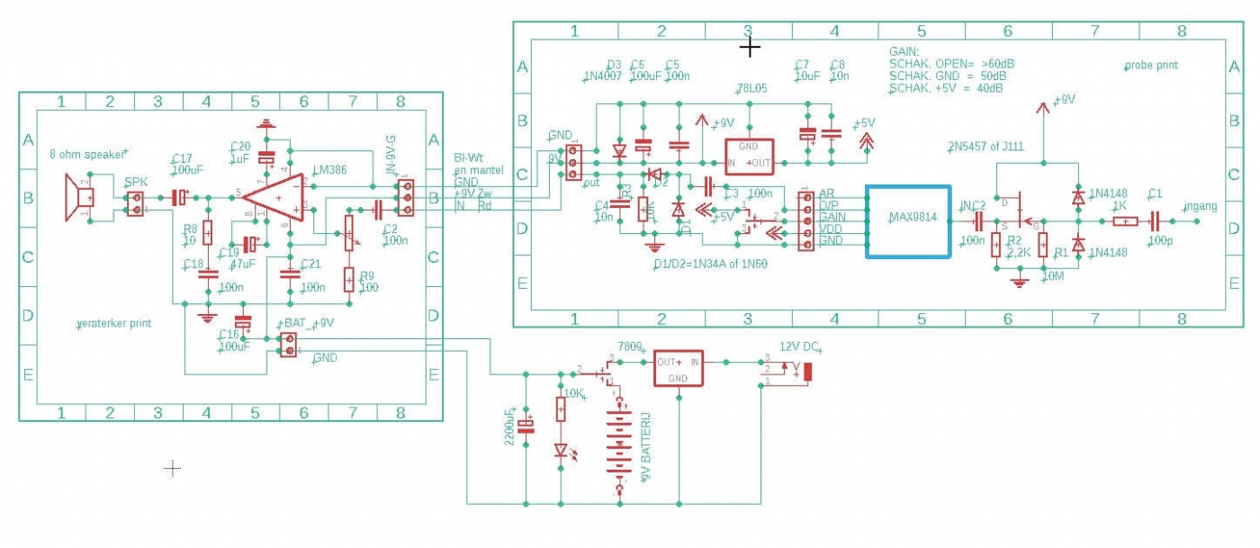 De ingang van de probe was hoogohmig (10M) door gebruik te maken van een JFET. De ingang condensator is slechts 100 pF . Hierna werd het signaal versterkt door een module die normaal gebruikt wordt als microfoon versterker. De versterking is met een 3 standen schakelaar instelbaar van >60dB / 50dB en 40dB. De toegepaste unit die opgebouwd is met een MAX9814 heeft ook nog een AVR . Nu weet ik niet of dit wel handig is bij fout zoeken omdat niveau variaties minder goed hoorbaar zouden kunnen zijn.
