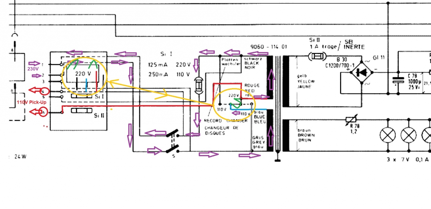 Ik ben in het bezit van een Grundig radiomeubel KS 724, Chassis-nr: CS 12 (van ca.1969), ooit nieuw gekocht door mijn ouders. Het apparaat krijgt geen spanning meer. Ik heb vastgesteld dat één van de twee te schakelen draden van de aan-/uit schakelaar, welke door een kabeltje wordt geactiveerd vanaf diverse druktoetsen, niet meer werkt. Toen ik het printplaatje met de 2 zekeringen en de 220/110 V schakeling van het chassis losmaakte lieten spontaan een aantal soldeerverbindingen met het plaatje los. Met behulp van een schema op dit forum heb ik ze weer gesoldeerd. Aangezien ik een leek ben in schema's lezen, leek het mij verstandig om een advies te vragen voor ik de radio weer onder stroom zet. Het gaat om de bovenste 4 pennen van de achterkant van het 220/110 Volt schakelblokje. mijn volgorde is van links naar recht: zwart, rood (of oranje), blauw en grijs.