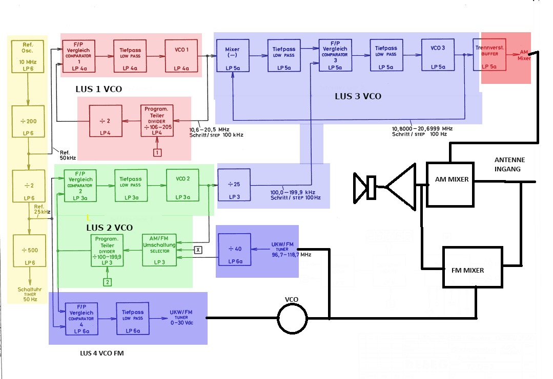 De eerste VCO1 wordt gelokt aan het 50 KHz signaal en is aangegeven in de kleur lichtrood. Het signaal uit de VCO1 heeft een bereik van 10,6 MHz tot 20,5 MHz. Door digitale deling wordt dit naar de 50KHz gebracht en dan vergeleken met de 50KHz uit het kristal. In de fase vergelijker komt bij verschil een DC spanning die de VCO via een varicap dioden bij regelt. De waarde van de digitale deling wordt bepaalt aan de hand van de ingevoerde gewenste frequentie waar naar geluisterd wil worden.