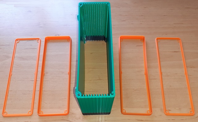 De eerste versie is voor een simpele behuizing. De tweede versie geeft een mooier afgewerkte rand. De rand bestaat uit twee delen. Dit om de bezitters van een 3D-printer zonder mogelijkheid met opvulmateriaal ook een printbare versie te geven. Eventueel kun je de twee delen daarna aan elkaar lijmen. De body van deze versie is wat korter, omdat er wat ruimte nodig is voor de bevestiging van de bezels.