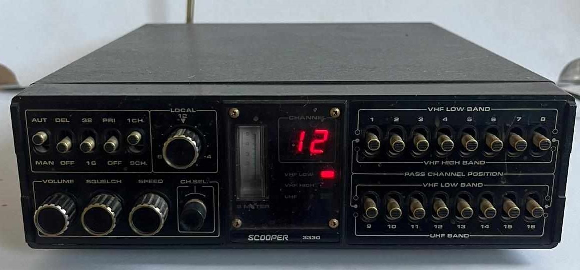 Dit is/was het topmodel van Scooper: de Scooper 3330 met zijn digitale uitlezing, S-meter, Priority en regeling van de scansnelheid. De scanner heeft plaats voor 32 kristallen en 12 lokale kristallen en beschikt over de volgende banden: