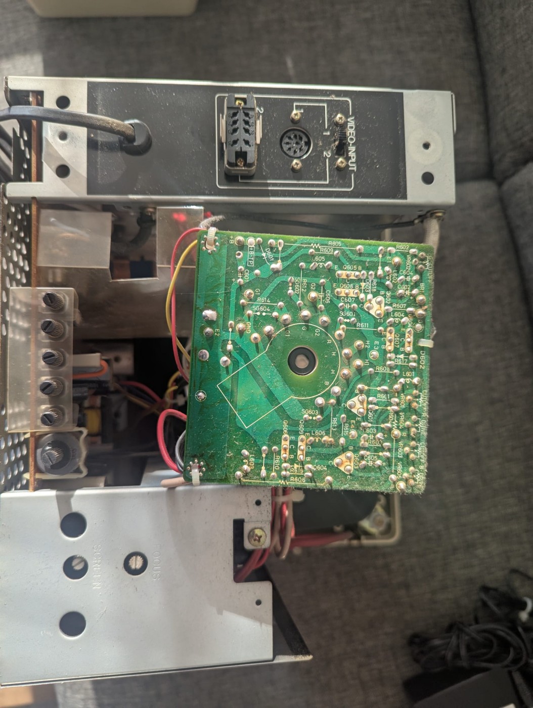 Besloot toen er toch maar even spanning op te zetten en .... toen was het duidelijk waar het geknetterd heeft en weer knetterde. Het is de lijntransformator, dat was op zicht duidelijk waar te nemen (vonken) en ook de reuk was overduidelijk.